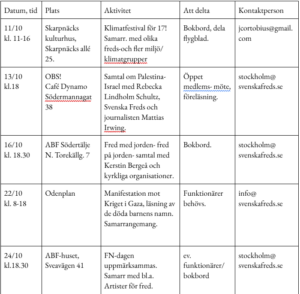 Vill du engagera dig i Stockholms Fredsförening? Besök Stockholms Freds sida på Facebook där vi löpande uppdaterar om evenemang, föreläsningar och annat. Klicka här för att komma till vår sida på Facebook. Du kan också kontakta styrelsen på stockholm@svenskafreds.se