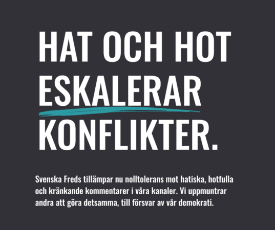 NOLLTOLERANS MOT HOT OCH HAT 2025-10-16 Hat, hot, hån, kränkande, nedsättande och förlöjligande retorik är ett allvarligt samhällsproblem. Svenska Freds tillämpar nolltolerans mot hot och hat. Läs mer