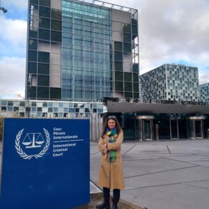 Svenska Freds ordförande Kerstin Bergeå vid ICC i Haag, december 2024.