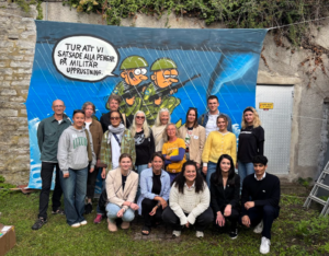 Svenska Freds ideellt aktiva, fredscoacher och kansli framför teckning av Max Gustafsson.